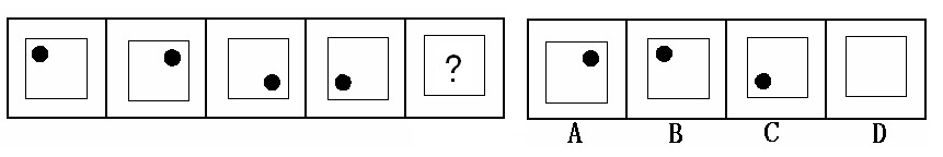 (答案:B。黑點在正方形中順時針移動。在第5個圖形中,應(yīng)該正好移動到左上角。)